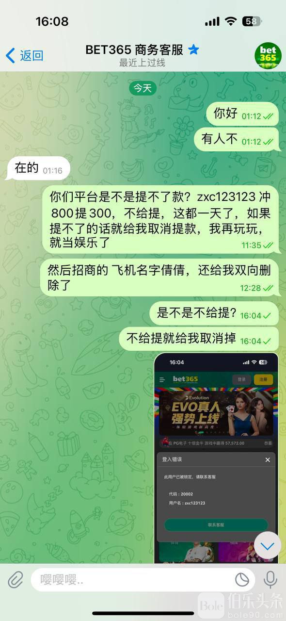 Bet365777这个平台,是我太长时间没有接触网赌了,第一次见这么没有格局的平台,充值500,提款300,一直没到账,我也没在意,想着就是慢,然后就又冲300,输完之后,我想着问问怎么还没到账,结果发现飞机被双向删除了,我联系客服,客服也不回复,然后联系他们首页的国际商务,想着就算不到账我也认了,把提款取消了,我再玩玩,就当娱乐了,结果他妈的把我账号给封了,我都不能用无语来形容了,提款300元都黑,这么没格局吗?大家找平台时最好是擦亮眼睛,尽可能找大台子,起码不至于几百块都黑,这台子……啧啧,钱不多,就当长个记性!