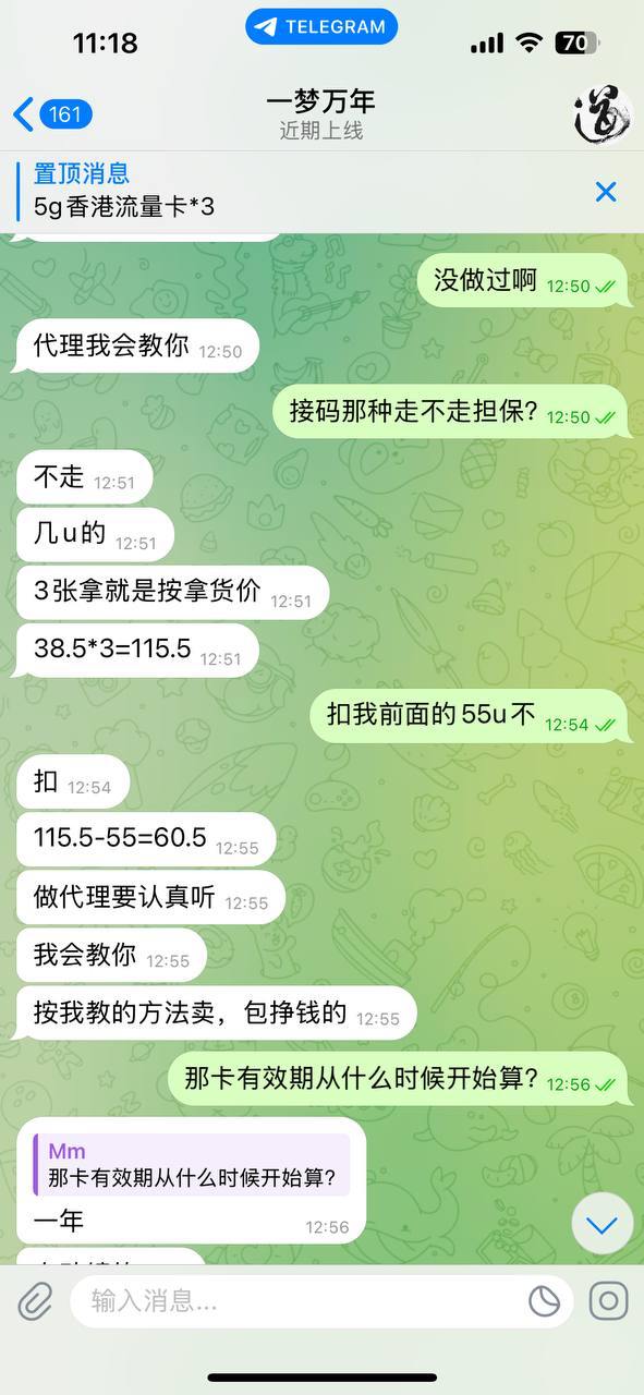 骗子在群里发布广告卖手机卡,在群里揭露各种骗子,树立自己形象,之后让在他那买,买卡后诱惑你可以做他代理,包赚钱,并说48小时发货,到48小时后,直接把双方聊天记录删除,并拉黑,还自己改了名字。总被骗119u,就当给骗子提前烧纸了,不要贪小便宜吃大亏啊。