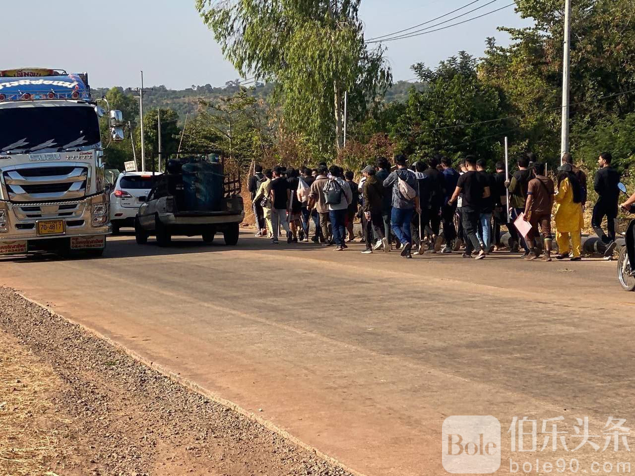 柬埔寨班迭棉吉省和奥多棉吉省,一大群50多名多民族外国人逃离了奥多棉吉省奥斯马赫的一家赌场,他们手持棍棒、棍棒、棍棒和刀,在前面行进。通往 O'Smach 国际大门的道路。