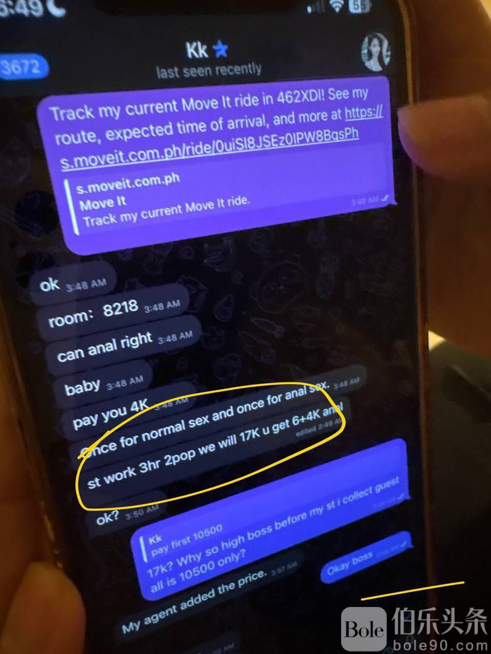 她说她时间就是3个小时我很震惊,我说你老板给我说的是6个小时,并给她展示了聊天记录,她也很震惊,她就给我看了她那边聊天记录,那边就是17000三个小时2次,但我这边那个逼给我说的是6个小时3次,后面妹子也去问了,其实这个逼不是她老板,她那边那个老板都跟了快2年了,这个逼她用英语翻译过来就是什么经纪人第三方中间商,我去找这个逼,这个逼开始已读不回,然后又说搞错了太忙了,态度傲慢嚣张,最后说信不信我叫妹子报警说你强奸,后面他清空了聊天记录,这个截图是我提前截图的,妹子也很委屈感觉被骗了哭哭啼啼的我就让她走了