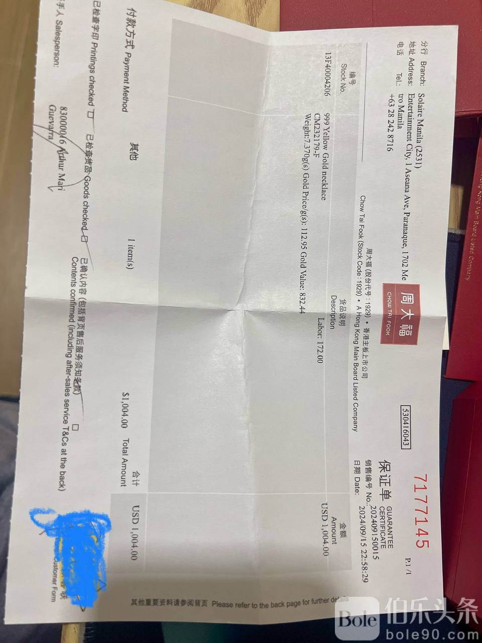 备                注:24年9月份购置于索莱尔周大福店,一切手续齐全,首饰盒,配套包装袋,周大福质检卡,购买发票齐全(签名涉及到隐私已涂鸦),买回家后一直闲置没戴,原价差不多快6万P,999千足金保值,现价4.5万P出,有兴趣的请私聊,只接受担保交易,不接受其他任何交易方式,绑匪和骗子别浪费大家时间,谢谢。