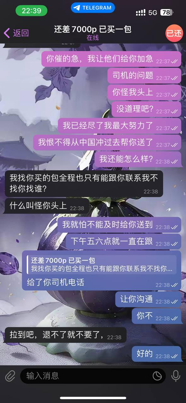 这位仁兄,可能真的很着急拿到货吧,正因如此,我就一直很紧张他这一单,小心翼翼地一直跟,神经紧绷地催空运快点发货,🉑有些时候真的就是怕啥来啥,偏偏空运就把他的货晚发了一天,偏偏空运第二天把他的货送到时,明明说好了优先,被那几个蠢笨的小菲搞黄了,最终没能把货送到他手里。甚至我把和空运都吵起来的聊天记录发给他,甚至跟他协商明天白天给他送过去,依然不依不饶。