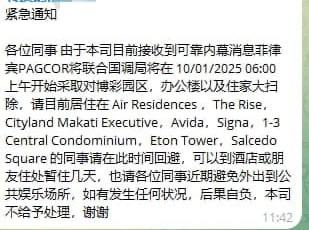 各位同事 由于本司目前接收到可靠内幕消息菲律宾 PAGCOR 将联合国调局将在 10/01/2025 06:00 上午开始采取对博彩园区,办公楼以及住家大扫除,请目前居住在 Air Residences ,The Rise,Cityland Makati Executive,Avida,Signa,1-3 Central Condominium,Eton Tower,Salcedo Square 的同事请在此时间回避,可以到酒店或朋友住处暂住几天,也请各位同事近期避免外出到公共娱乐场所,如有发生任何状况,后果自负,本司不给予处理,谢谢