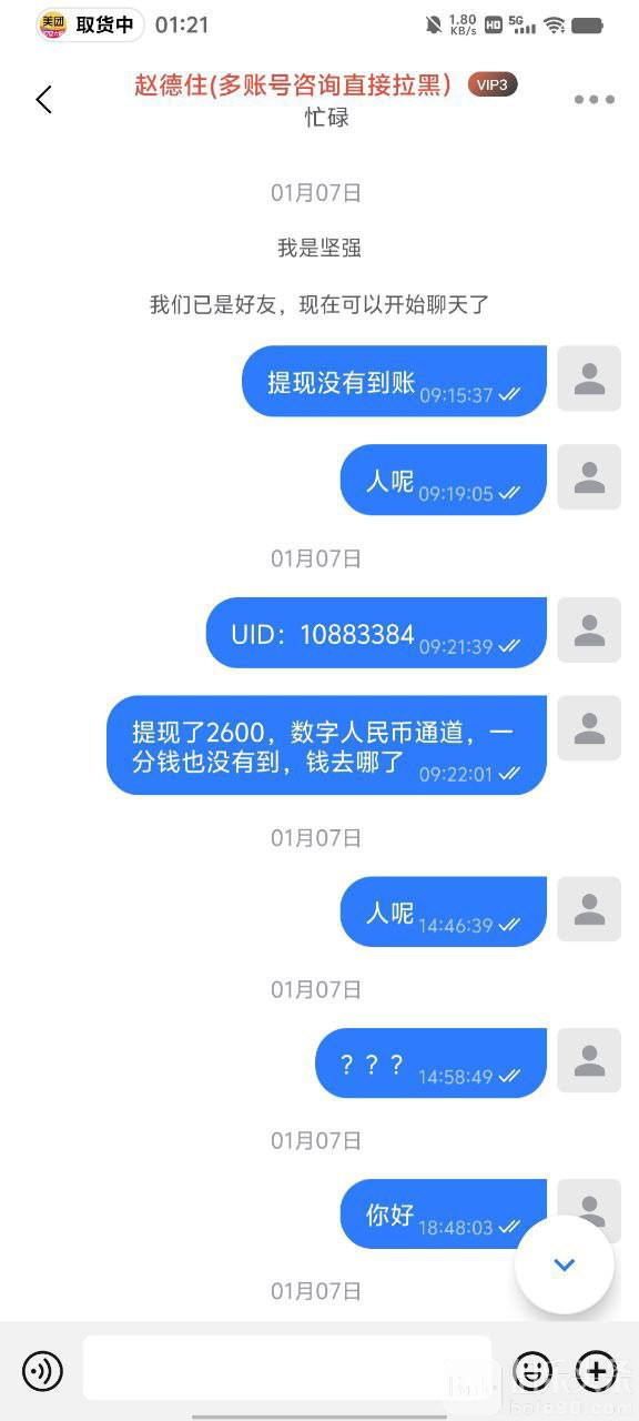 之前多多少少几百几千都一直下款,后面这两个月一直输,总共输了几万块钱。那天提款2600没有到账,数字人民币是无法删除交易记录的。我去找提现客服,客服他们一直打圆场,要嘛就是不会消息,看了消息也不回。反正就是摆明了要吃这个钱嘛。钱我输的起,最重要的是不放款,你把钱退回来呀,直接黑吃是个什么意思。演都不演了吗?NG客服旺旺:330000  提现客服旺旺:556677