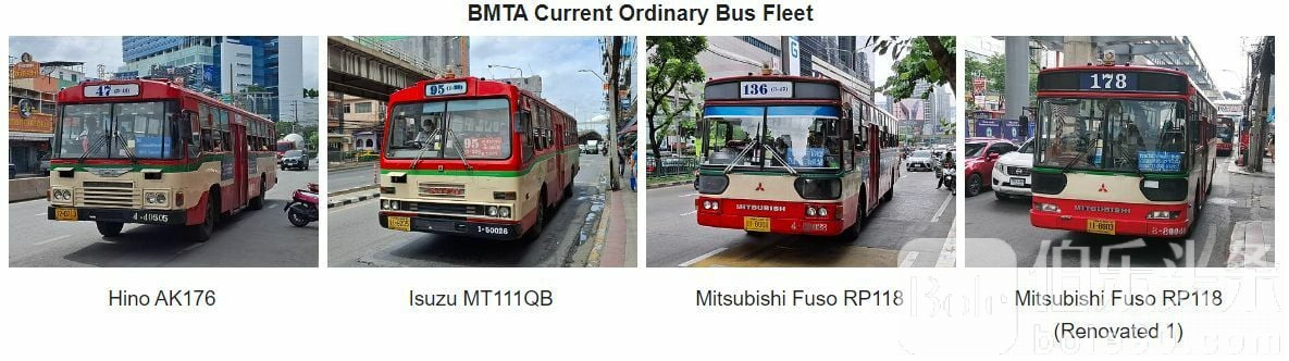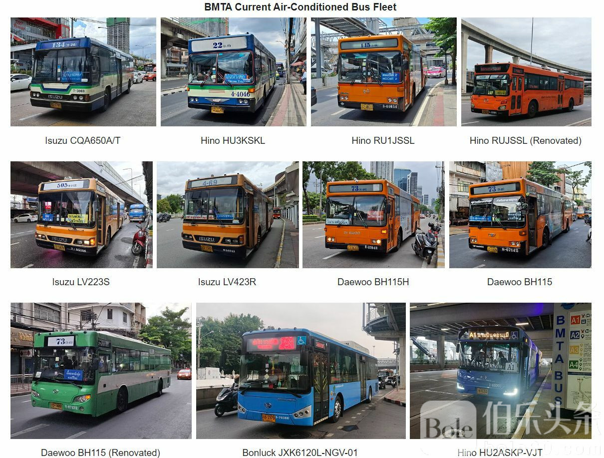 曼谷的公交系统包含几种不同类型的公交车,这些车根据路线和设计有着不同的标记,通常可以通过车身的颜色或标识来区分。
