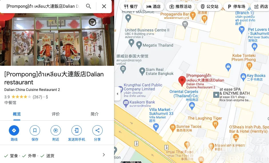 这家店位于素坤逸 33/1 巷,在巷子深处,晚上去的话,光线较暗,没去过的人可能还需要多找一下。(距离轻轨站Phrom Phong 很近, 当然在铜锣3巷,还有一家大连饭店)