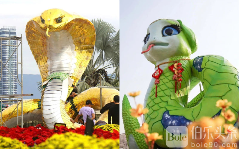 "Cuộc đua" linh vật rắn - biểu tượng của năm Ất Tỵ - đón Tết Nguyên đán đang diễn ra rất sôi nổi và thu hút sự quan tâm của đông đảo cộng đồng mạng. Trong ảnh là một trong những linh vật rắn nổi bật đang "làm mưa làm gió" những ngày qua, được lắp đặt ở thành phố biển Đà Nẵng. Chú rắn hổ mang màu vàng với thần thái sinh động, đôi mắt sắc bén và dáng cuộn mình đầy khí thế này là tác phẩm của nghệ nhân Đinh Văn Tâm, người tạo ra linh vật mèo, hổ, rồng gây sốt những Tết trước. (Ảnh: Xuân Tiến)