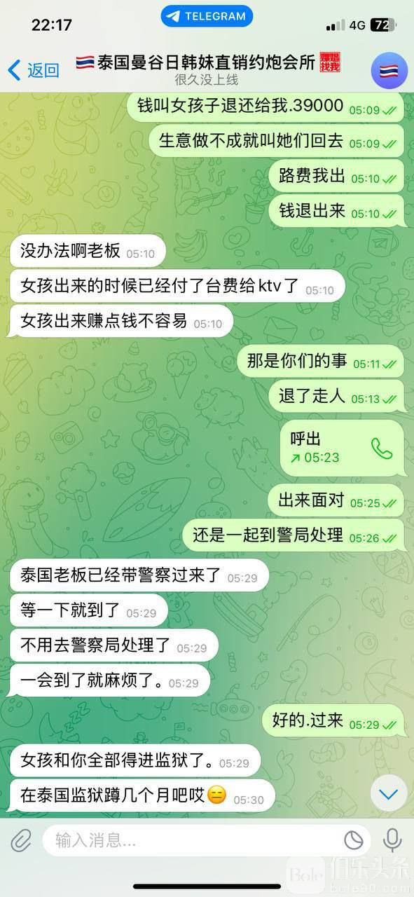 昨晚在这个频道叫了3个女孩,说好2小时1个1万3泰铢,结果来了3个女孩,说要先收款,就给了她们3万9泰铢,给完钱女孩子说一人要5万泰铢。