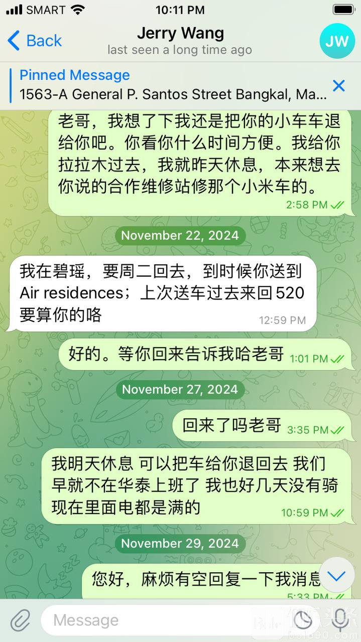 这个当时把二手滑板车卖给我的时候,保证的话说得天花乱坠(人品担保,有任何问题可以找他,他有合作的维修网点等),我骑了两天第一时间给他吐槽车子减震效果不好,因为菲的路况大家都知道,如果哪哪都很平坦我也就将就骑了,他听到我抱怨直接就说“你不想要就退钱,他不介意”