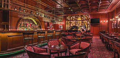 酒吧充滿古老的英式風格,深色的木材頂棚,舒適的扶手椅,凸窗上華麗的絲紗,呈現一派獨一無二的深情友好氣氛。勞累一天之後,這裏却是放鬆身心的理想境界。豐盛的酒吧美食,加上含酒精和不含酒精的各種飲料,任君選擇。