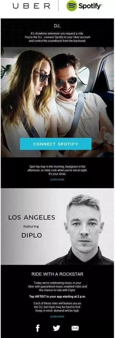 以下是一封倡导音乐乘车的邮件,Uber介绍了Spotify,并且为用户提供和摇滚明星Diplo共乘的机会。Uber类似打车喜获冰激凌、做过装饰有艺术作品的卡车等有趣的主题推广邮件对于热爱尝鲜的打车年轻族消费群体来说,更乐于参与其中,并形成对活动的口碑宣传。