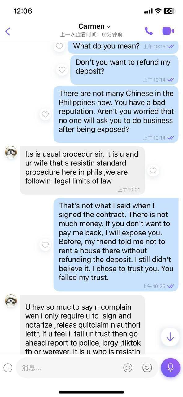 各种理由刁难我们外国人,她老公是会说中国话 不知道是那里人, 起因是这样的 ,我在2024年初 租了安泰一个房子,找的中介签合同当初说好合同到期后我搬走会给我退押金,然后我搬走之后让我老婆去找她要押金 让我写什么授权书 然后我的护照照片我的签字, 然后去公证,然后欺诈我老婆让我老婆写退出声明,一旦写了之后就会自动退出索取押金的权益,我找她之后她还说合法的,在菲律宾合不合法我不知道 我知道 你黑着良心赚的我的血汗钱,然后说好的押金也不给退,钱是小事,希望有我这个前车之鉴  中国的同袍们擦亮眼睛 毕竟谁赚钱都不容易, 以后租房子 不要找一些不靠谱的  不管是租房子还是办理其他事情都要找靠谱的 或者有保障的。异国他乡不要被骗被坑。