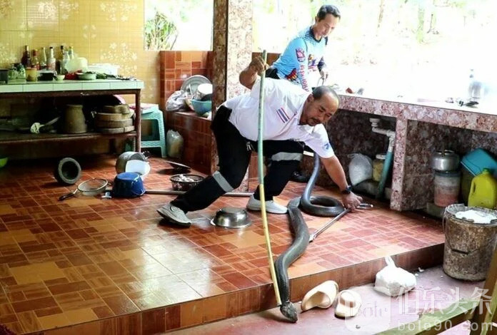 春蓬府一名 55 岁的妇女正在吃饭时,突然发现一条长达 4 米、重约 8 公斤的眼镜王蛇悄悄进入了她的厨房,这让她吓了一大跳。她立刻放下饭菜,拨打急救电话寻求帮助。