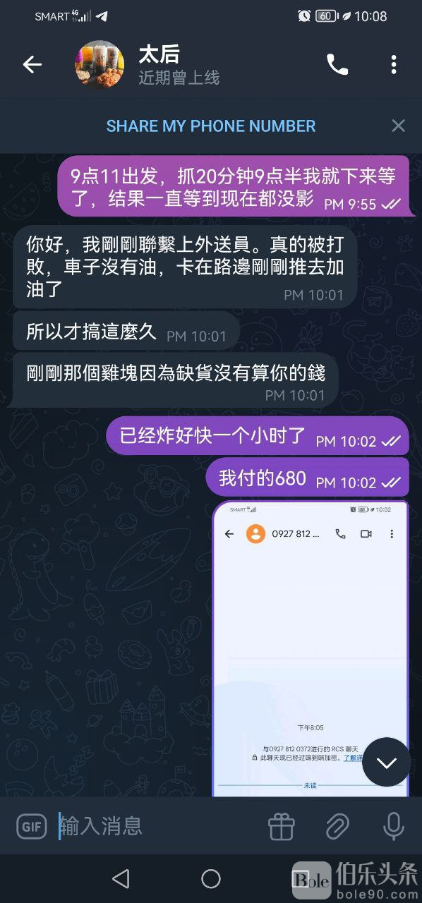 结果一个小时了才说刚做好要出发,我想着那应该也快到了,结果3公里的路程用了一个多小时骑手才打来,中间催促过说骑手摩托车没油(但谁信呢?)