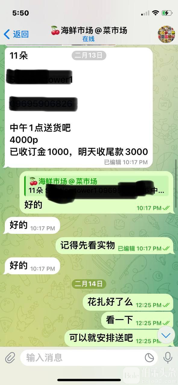 1,2月13日我从商户这里订花,商户让交订金1000P,我也是老客户了,就把订金交了。