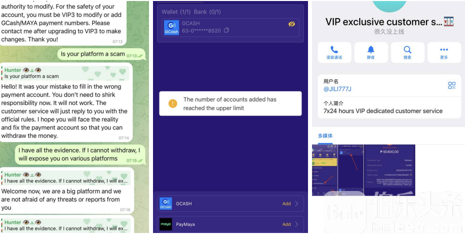 套路3、人为修改你的提款账户错一位数字,当你提款说账户错误,让你联系专线客服后,又说更改账户需要再存款3000。感觉不对劲,直接不存款,客服那傻逼也是动不动就拉黑。