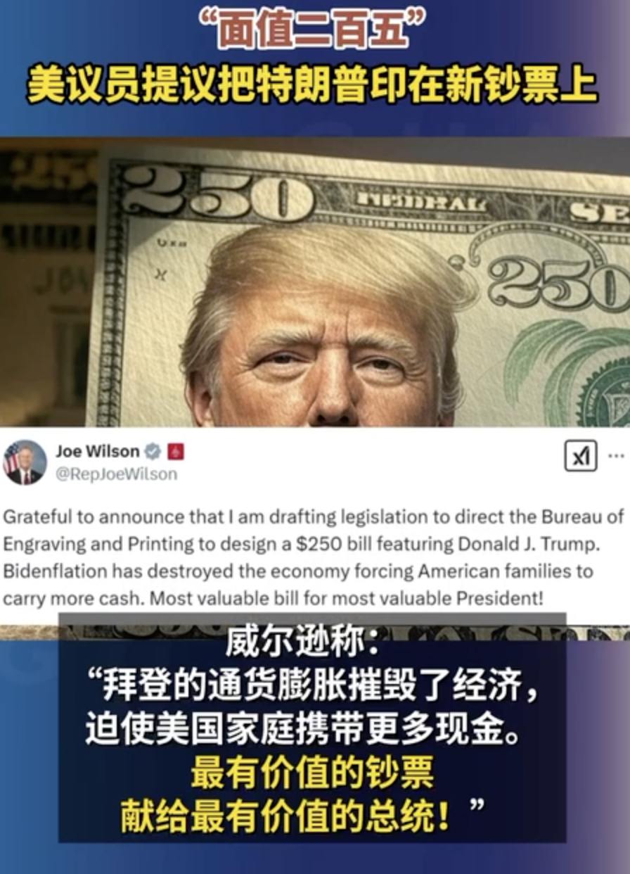 “面值250”‼️美国议员提议把特朗普印在新钞票上🤣🤣🤣