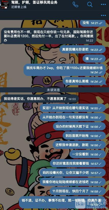 纯纯把人当傻逼耍,也怪自己傻逼嫌麻烦不去达沃办,找这个骗子办理,一本33000p本人不用去,比市场高8000p,办理两本总计被骗66000p,还没办理的时候,信誓旦旦两天下证,结果时间到了证没下来,就开始说车管所系统更新啊,反正就是各种理由拖到现在四个月,不退钱不处理不退款,说达沃渠道商跑了,要么补钱换别的方式,真是牛逼,我花钱找你办事,你没办成还要我来承担损失,闻所未闻