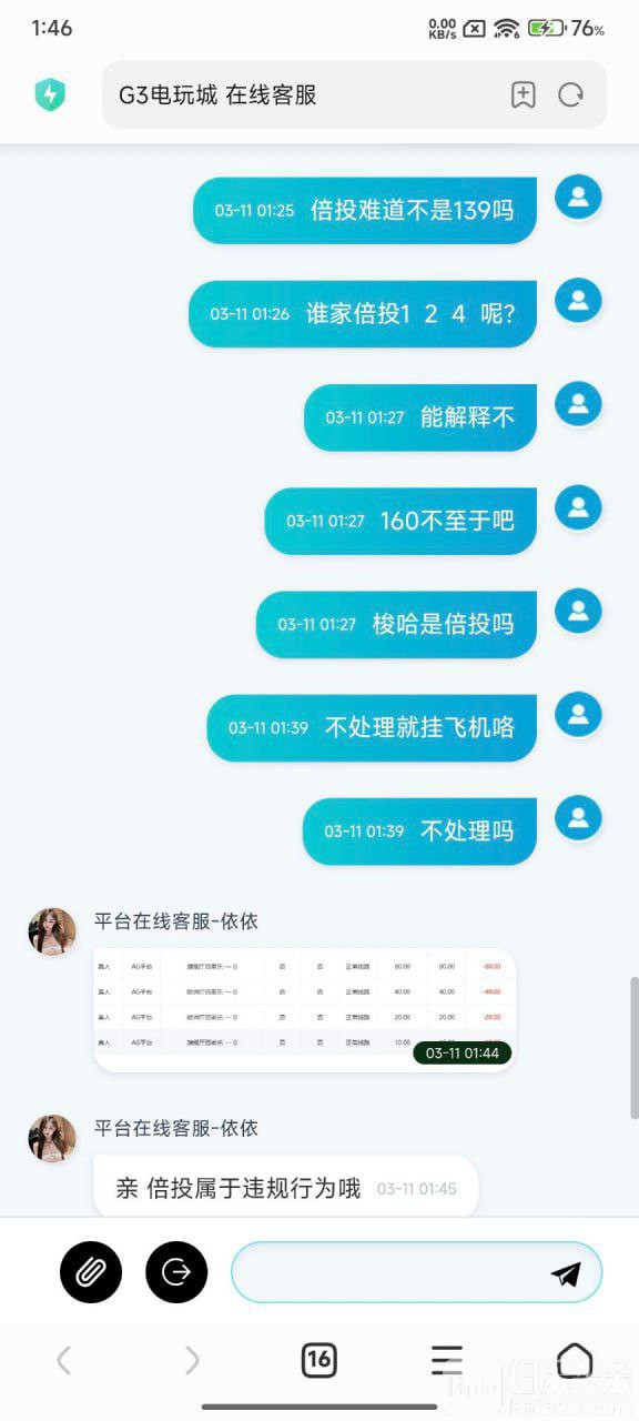 我去问客服,客服给我说真人流水只计算25%,怎么算流水也够啊10+20+40+80=150,150*0.25=37.5,怎么算我流水也够啊,让我去打电子补10块流水,补完我去提款,提款160,后面给我驳回,完事直接给我钱扣了,我找客服,客服说我倍投违规,我难道不是梭哈吗?梭哈都不允许吗?