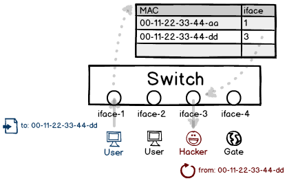 然而这种学习并不智能,甚至太过死板,任何一个道听途说都会当作真理。用户发送一个自定义源 MAC 地址的包是非常容易的,因此交换机成了非常容易被忽悠的对象。只要伪造一个源地址,就能将这个地址关联到自己的接口上,以此获得受害者的流量。