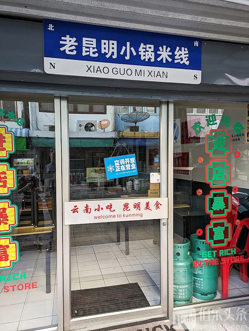 老昆明小锅米线,没错,店名就是这么的朴实无华!小店开在辉煌区430号,小小的门面,是稍微不注意就会错失的那种,但是专程前往的真爱粉们会注意到这蓝底白字的招牌。第一次去的朋友可以蓝线MRT搭到Sutthisan站出来,然后google地图走路大概15分钟左右就能到达(或者搭乘摩的更方便,5分钟即可到达~)