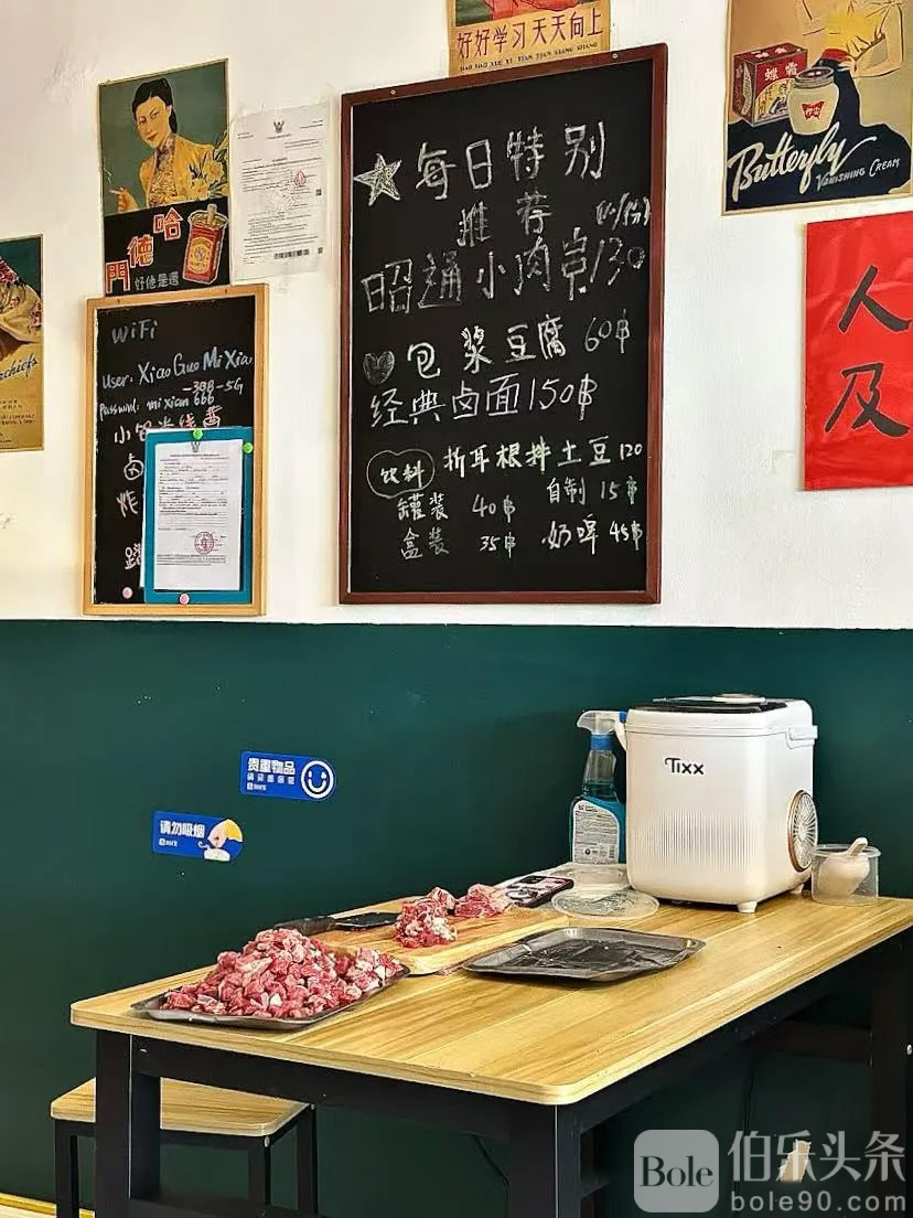 走进店里,浓厚的市井气息迎面而来。店面不大,装修简单,墙上挂着一些各式各样的老照片和手写菜单,虽然只有6张桌椅,但干净整洁。空气中弥漫着米线的香气,混合着酸菜、辣椒和酱肉汤的味道,让人瞬间食欲大开。