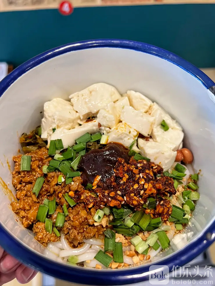 店里还有一个招牌特色,就是这个黏糊糊的「豆花米线」。烫好的米线,铺上肉酱浇头、辣子花生,最后再加上一勺当天现做的鲜豆花,吃之前全部搅拌开来。嗦上一口,米线的Q弹、辣子的麻香、豆花的清新豆香、全部在嘴里爆开来,喜欢清爽细腻同时又麻辣鲜香口味的朋友一定要试试啊~