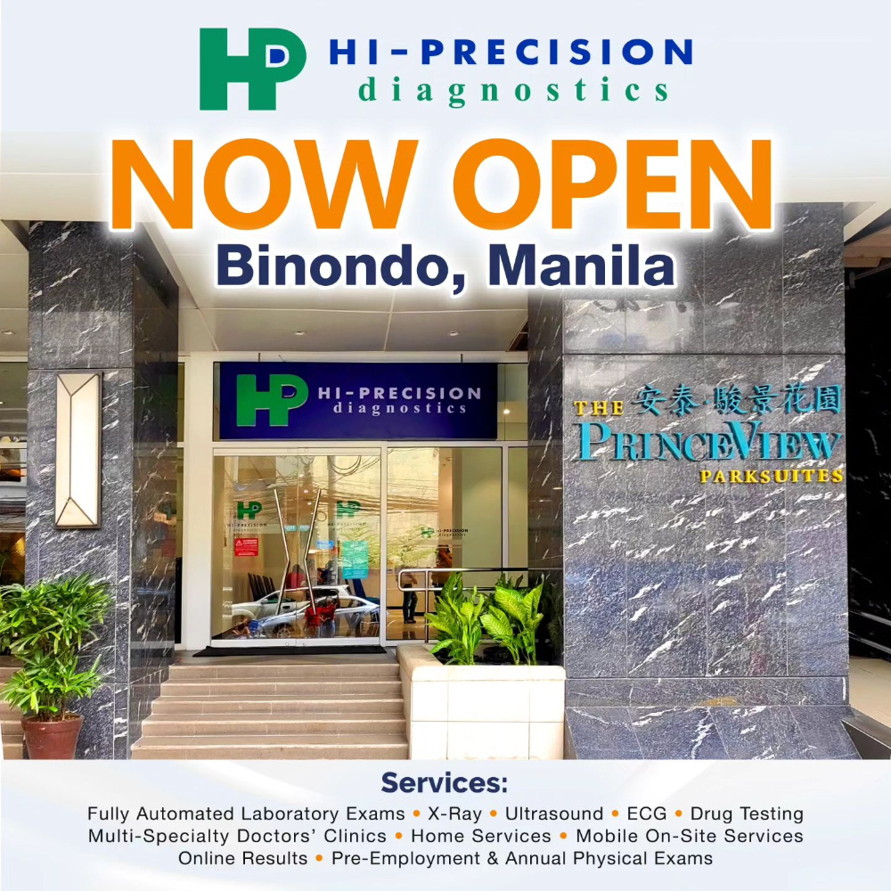 3. Hi Precision医学化验中心 体检服务:心电图、血液检验、X光 地址:GF, Princeview Parksuites(骏景花园),Paramount Building 434 Quintin Paredes Street, Barangay 289 Zone 027, Binondo Manila 联系方式:(63) 922-890-6671;(632) 8741-7777 营业时间:周一至周六 早上6点至下午3点