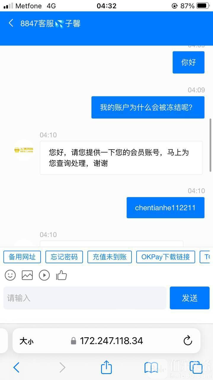 3月25日醒来后,我再次尝试提现,发现账户已被冻结。我联系线上客服和飞机上的客服,却无人回复。甚至飞机客服还删除了之前的聊天记录,疑似直接拉黑了我。