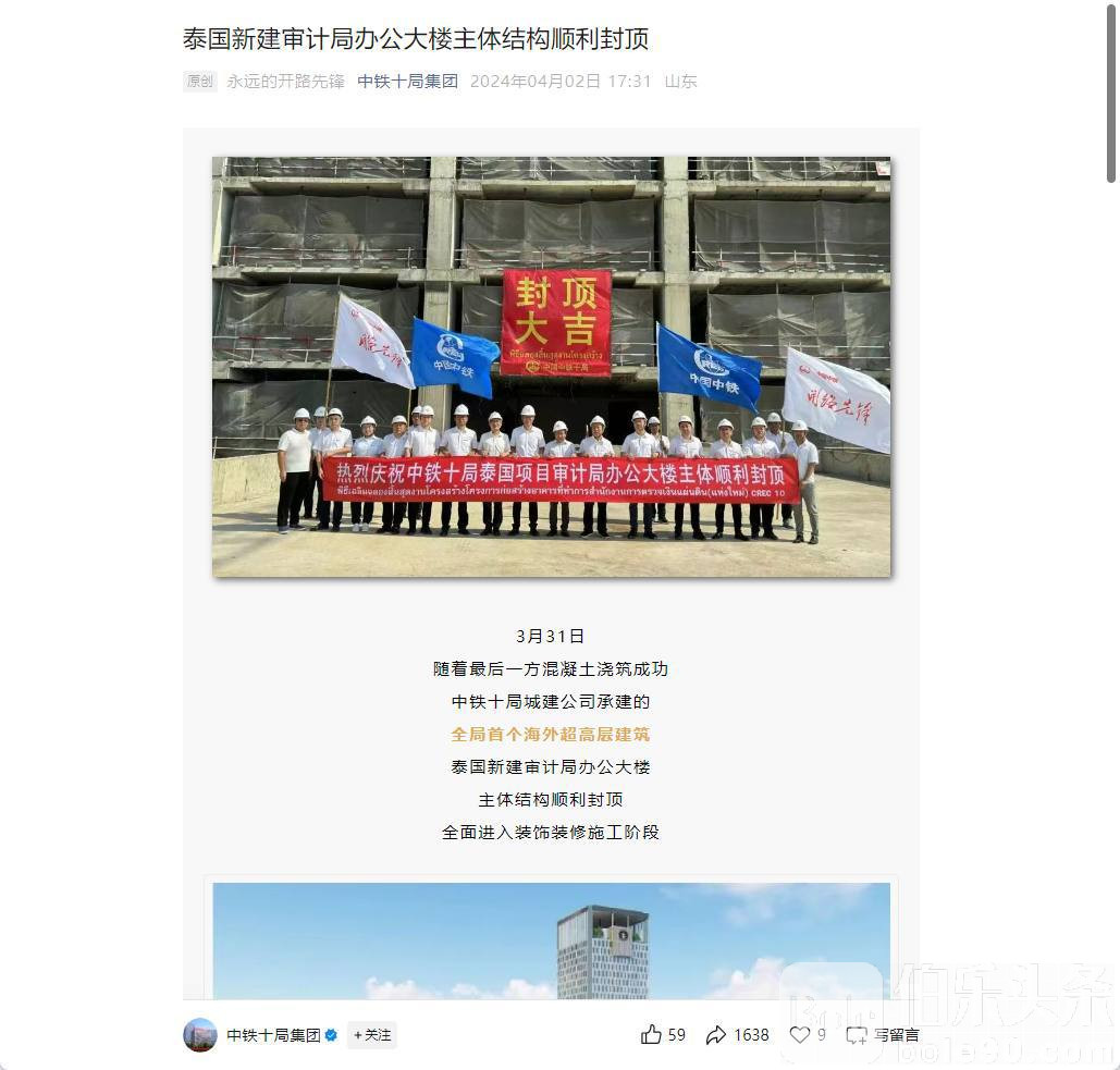 原本在建的33层国家审计署大楼,是曼谷唯一受缅甸强震影响倒塌的建筑物。该大楼由合资企业ITD-CREC意大利泰发展有限公司与中国中铁十局(泰国)有限公司组成的联合体承建。大陆财新网报导指,这是中国中铁十局首个海外超高层建筑。