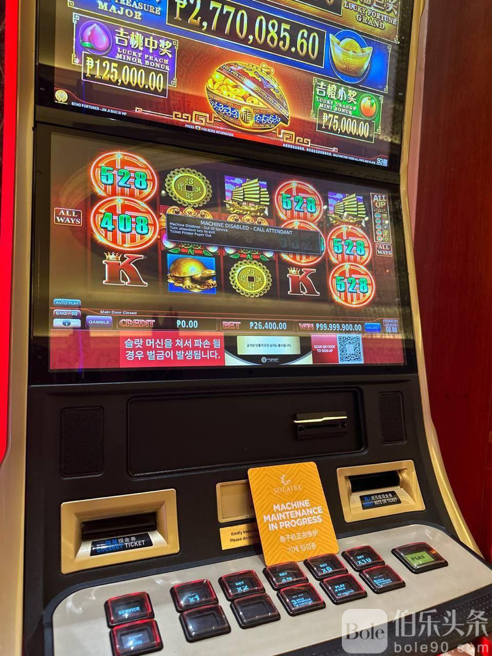 索莱尔老虎机又出亿元大奖了,这次打的大,打26400披索一口。