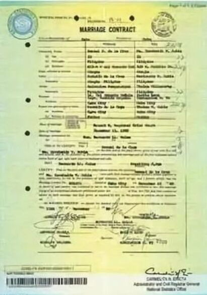 结婚后须持市政府或教堂核发的结婚登记材料至菲律宾统计局(PSA)办理结婚登记材料的扫描录入和认证,等待一到三个月左右,PSA就会核发结婚证书(Certificate of Marriage)。