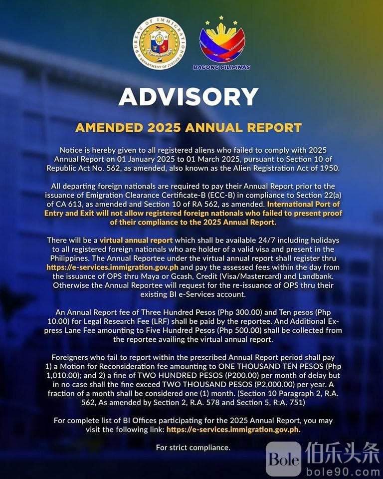伯乐头条专讯:菲律宾移民局近日发布通告,提醒所有长期签证持有者,如果错过了今年1月1日至3月1日的年度常规报到,将面临限制出入境的处罚。