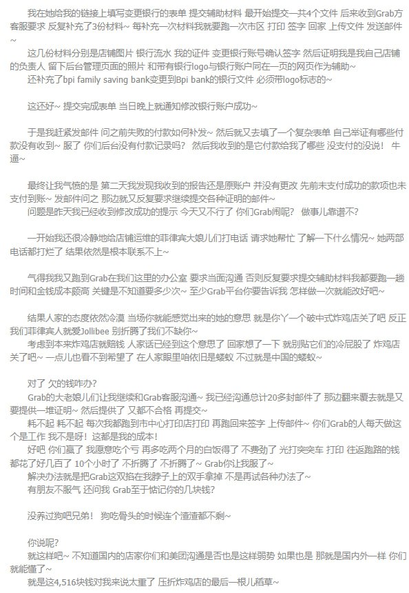 这一脚就是Grab反复刁难我 当然也可以说我的体量配不上Grab这个大平台 它总是拖延或者说拒付我炸鸡店4,516块钱的销售款 且已经拖延近一个月之久 让本来就周转困难的店彻底丧失了运转的可能性~