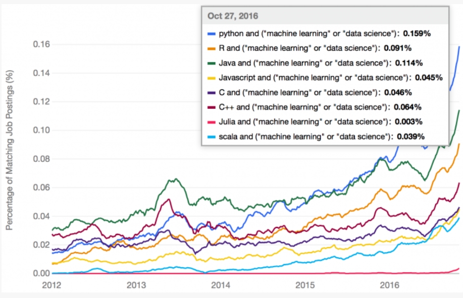 进入 2016 年后,市场对所有语言的需求都大幅上涨。Python 并没有与其他语言拉开明显差距。这表现出,最近一年里业界对机器学习和数据科学整体的兴趣和重视。