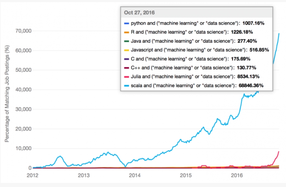 Scala,Julia,Lua 在机器学习、数据科学领域的雇主招聘指数增长率