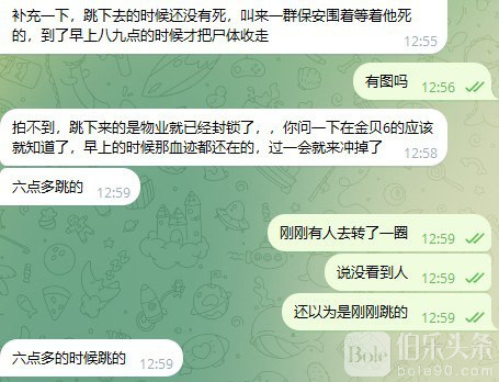 金贝6有人跳楼,跳下去的时候还没有死,叫来一群保安围着等着他死的,到了早上八九点的时候才把尸体收走。