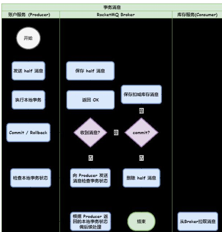 RocketMQ 的事务消息是通过 half 消息来实现的。以电商购物场景来看,账户服务扣减账户金额后,发送消息给 Broker,库存服务来消费这条消息进行扣减库存。如下图: 可见,RocketMQ 只能保证生产者发送消息和本地事务的原子性,并不能保证消费消息的原子性。