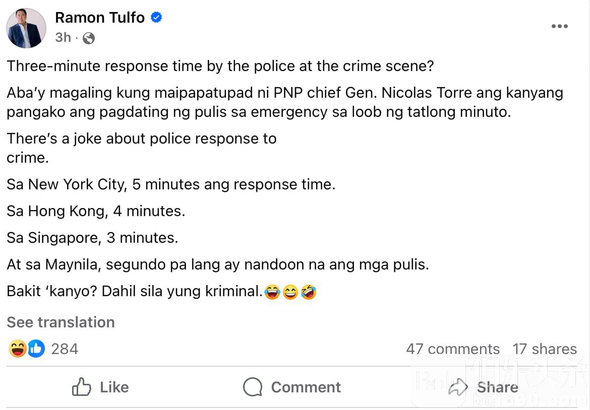 菲律宾国家警察局长尼古拉斯·托雷将军曾承诺,将努力让警察在三分钟内赶赴任何紧急现场。如果这一目标真能实现,无疑将是治安改善的一大进展。但在许多菲律宾民众心中,这个承诺更像是一个讽刺的笑谈。