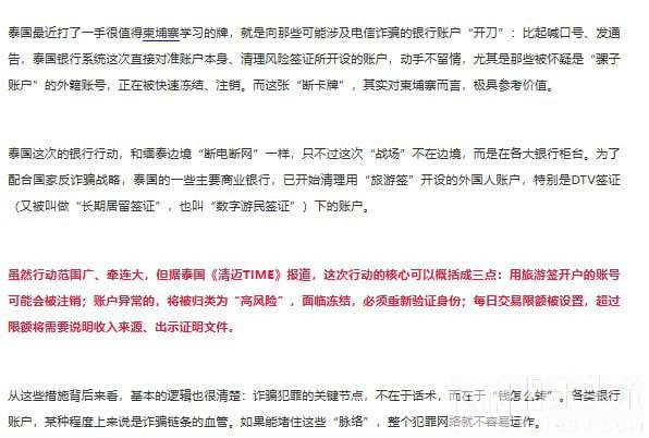 泰国最近打了一手很值得柬埔寨学习的牌,就是向那些可能涉及电信诈骗的银行账户“开刀”:比起喊口号、发通告,泰国银行系统这次直接对准账户本身、清理风险签证所开设的账户,动手不留情,尤其是那些被怀疑是“骡子账户”的外籍账号,正在被快速冻结、注销。而这张“断卡牌”,其实对柬埔寨而言,极具参考价值。