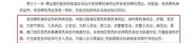 ameccy:新版《民用航空安全检查规则》里面写的有效身份证件包括中国大陆的护照啊……想想看好多在国外定居的中国公民早就注销了国内户口(以前有规定),只有中国护照,不可能办出身份证的,就不让坐国内航班了?!不过往来港澳/台湾通行证确实没写在新版《规则》里,大坑啊!