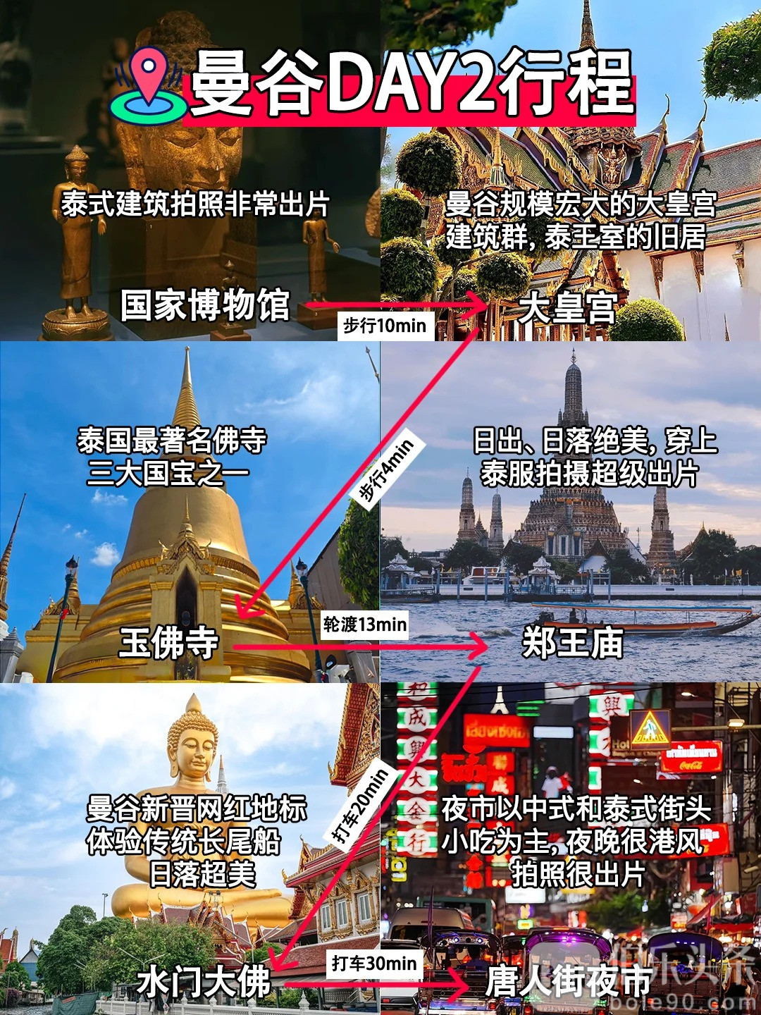 第二天|文化探索与传统魅力 • 史泰国博物馆 展现传统泰式建筑风格,院落安静,适合散步和拍照。 • 大皇宫 曼谷必游地标,建筑金碧辉煌,泰国王室的重要象征。 • 玉佛寺 位于大皇宫内,是泰国最神圣的佛寺之一,供奉着国宝级玉佛。 • 郑王庙(黎明寺) 湄南河畔的经典景点,傍晚时分日落美景极佳,适合穿泰服拍照。 • 水门大佛 + 长尾船体验 搭船前往新晋热门打卡地,途中欣赏河岸风景,体验传统交通方式。 • 唐人街夜市(Yaowarat) 美食与文化兼具的夜市,中泰融合小吃丰富,是夜间觅食的好去处。