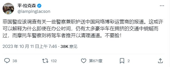 拉克森在他的推特帖子中表示,菲律宾国家警察(PNP)应该调查有关一些警察为中国POGO运营商护送的报道。