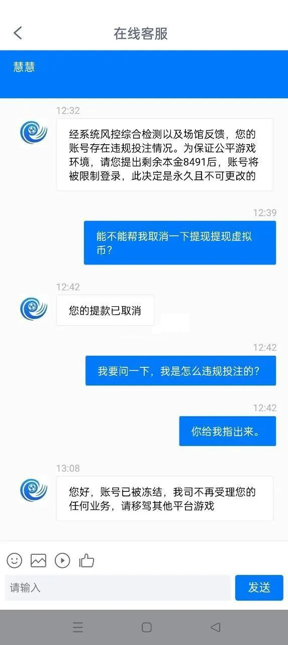 我怎么违规了?我问。回答是玩奔驰宝马下注要超过8个。然后我是从头到尾下注从来没有超过5个。我让他发我投注。但他就是发不出来,明摆着黑我。垃圾。