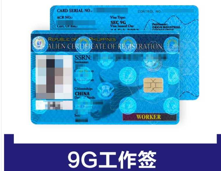 9G工作签证介绍 菲律宾的9G工作签证是目前菲律宾移民局颁发的工作签证,各个类型工作基本都涵盖,也是菲律宾劳工部认可的工作签证。 操作一般要经过税务局、劳工部 、移民局, 有些还要经过司法部特别审批。同时需要本人去移民局面试。特别是今年由于杜特地政府取消了CEZA卡卡湾以外地区的工作签证颁发,可以说9G成为所有在大马尼拉工作的外国人唯一的合法签证。 菲律宾9G工签并不是单纯的一张证明或一个卡片,而是由AEP(外国人就业许可证)与I-Card(外国人身份识别)合起来的总称,正宗的菲律宾9G工签是包含:ACR-I Card和工作许可证(AEP)。ACR-I Card代表你在菲律宾的身份证明,等同于你在菲律宾的身份证,非常好用。