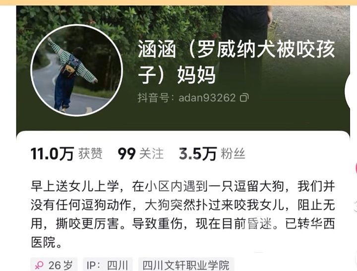 不知道大家有没有刷到最近国内很有热度且讨论度很高,并且引起社会广泛关注的一件事。那就是一名小孩(名字叫涵涵)被罗威纳犬咬伤的事件。简单描述一下事情的经过就是一只大黑狗没有拴狗链,扑上去咬伤了小女孩。导致小女孩肾脏撕裂。现在这只狗已经被安乐死了。