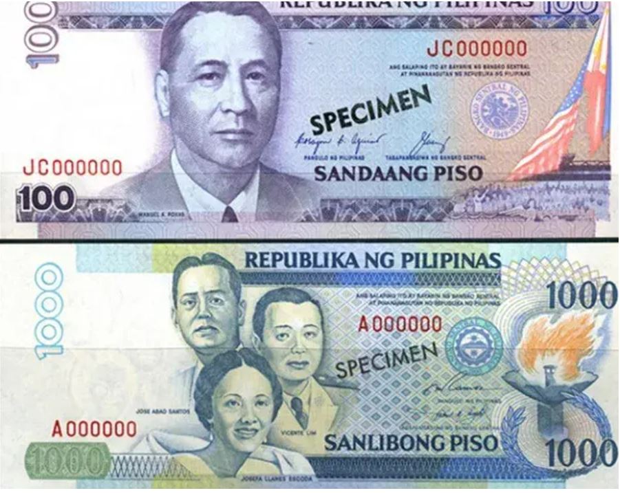 100比索,菲律宾第五任总统曼努埃尔·罗哈斯·阿库纳。他是菲律宾自美国手里成为独立民主国家后的第一位总统,币面右边还有两个国旗,一面菲律宾国旗一面美国国旗,象征着在二战以后菲律宾脱离美国的殖民统治,美国国旗降下而菲律宾的国旗升起。