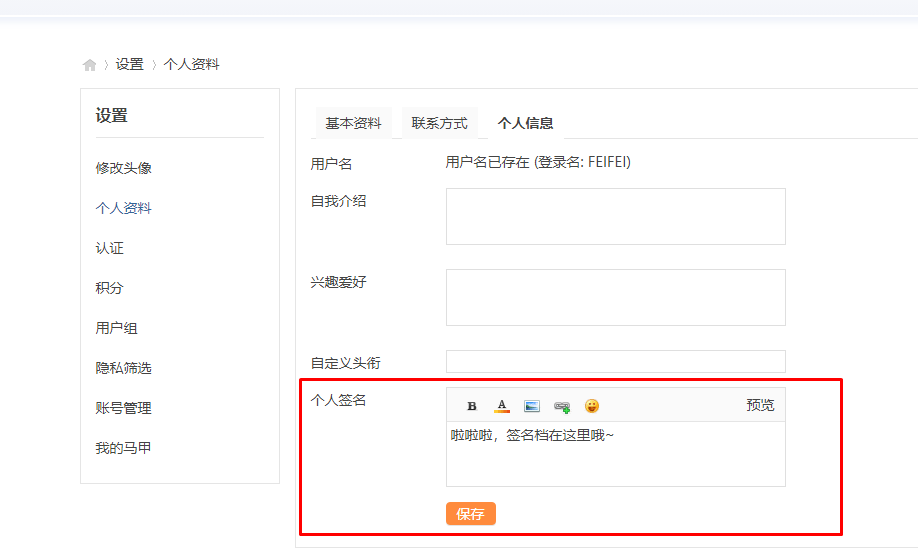 登录您的账户,进入个人设置,在个人资料的个人信息中找到个人签名选项。在此处,您可以编辑并自定义您的签名档,根据您的等级享受相应权限。(如图所示)