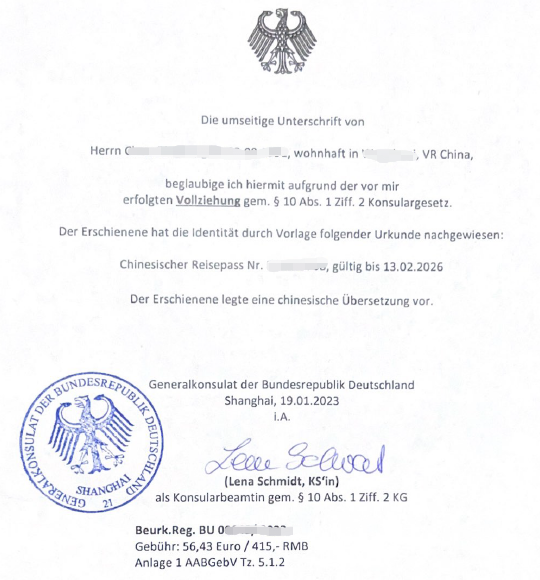 2. 海牙认证与使馆/领事认证的区别在海牙认证公约尚未在中国正式生效前,目前中国可行的认证方式主要是通过: – 使馆认证(德语Unterschriftsbeglaubigung),如下图2,即签字人直接携带文件前去驻华使馆进行签字认证,通常1天即可办理完毕。 – 领事(双)认证(德语Legalisation),如下图3,即签字人前去本地中国公证处公证,再将公证书递交省级外事办进行再认证,最后递交驻华使馆完成最终认证,通常需至少1个月左右。