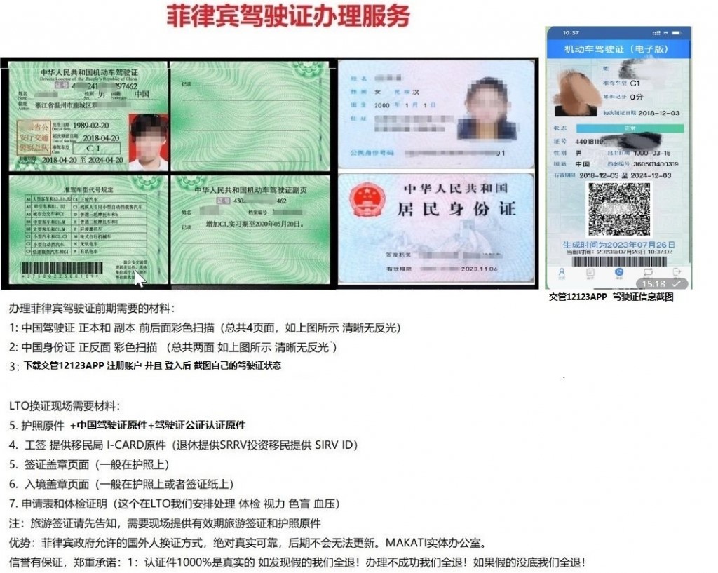02中国驾照如何换成菲律宾驾照? 中国人在菲律宾开车一般分为短期驾驶和长期驾驶两种情况。不管哪种情况都需要将未逾期的中国驾照递交到中国驻菲律宾大使馆公证,再将公证过的驾照递交到菲律宾的外交部进行认证。 短期在菲律宾驾驶车辆 根据菲律宾相关政策,中国人可以在菲律宾进行为期90天的短期合法驾驶,但需要使用中国驾照原件和办理的中国驾照双认证原件。而90天的有效期是根据入境菲律宾的日期开始算。 长期在菲律宾驾驶车 这种情况需要将中国驾照转换为菲律宾驾照,一般需要大家在菲律宾停留满3个月的时间才可以申请 中国驾照换成菲律宾驾照所需要准备的材料: 1.护照原件,有效期为6个月以上; 2.中国驾照原件及复印件,中国驾照双认证原件; 3.入境菲律宾签证纸的原件及复印件; 4.菲律宾签证或是I卡(ACR)的原件及复印件; 5.菲律宾交通部指定医疗机构出具的体检报告; 6.在菲律宾的居住证明。 携带准备好以上材料就可以去菲律宾LTO(陆运署,常说的交通管理局)申请换证。 正常情况下无需考试,基本当天就能拿到菲律宾驾照。除非中国驾照已逾期,那么就需要重新考试。 需要注意的是,菲律宾驾照与中国驾照稍有不同,第一次申请菲律宾驾照的有效期为5年,这比中国驾照的6年少了一年。驾照到期后可去菲律宾LTO重新申领。 正常情况下无需考试,基本当天就能拿到菲律宾驾照。除非中国驾照已逾期,那么就需要重新考试。 需要注意的是,菲律宾驾照与中国驾照稍有不同,第一次申请菲律宾驾照的有效期为5年,这比中国驾照的6年少了一年。驾照到期后可去菲律宾LTO重新申领。 在菲律宾开车需要注意什么? 菲律宾车辆全部都是靠右行驶的,这与国内的驾车方式相同; 菲律宾基础路况复杂,时常会出现TUTU车和摩托车抢道的情况,所以大家在驾驶期间一定要注意避让; 菲律宾城市道路的红绿灯较少,经常会出现堵车状况。红灯时除非有其他标志引导,否则全部都是禁止右转的。周末期间,菲律宾部分交通信号灯处于关闭状态; 虽然当地暂时没有法律强制要求使用儿童座椅,但如果携带有儿童的话,最好还是使用儿童座椅,以确保安全; 车辆行驶过程中全体乘客必须系好安全带,并且千万不能酒驾!